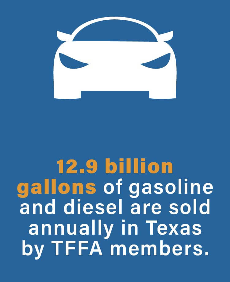 The Texas Food & Fuel Association is an industry champion for businesses who process, transport, and sell refined products made from crude oil. Members of TFFA own, operate, and supply in excess of 16,000 convenience stores, grocery stores, and truck stops. In addition, fuel marketer members distribute approximately 9 billion gallons of gasoline and diesel fuel throughout Texas each year.